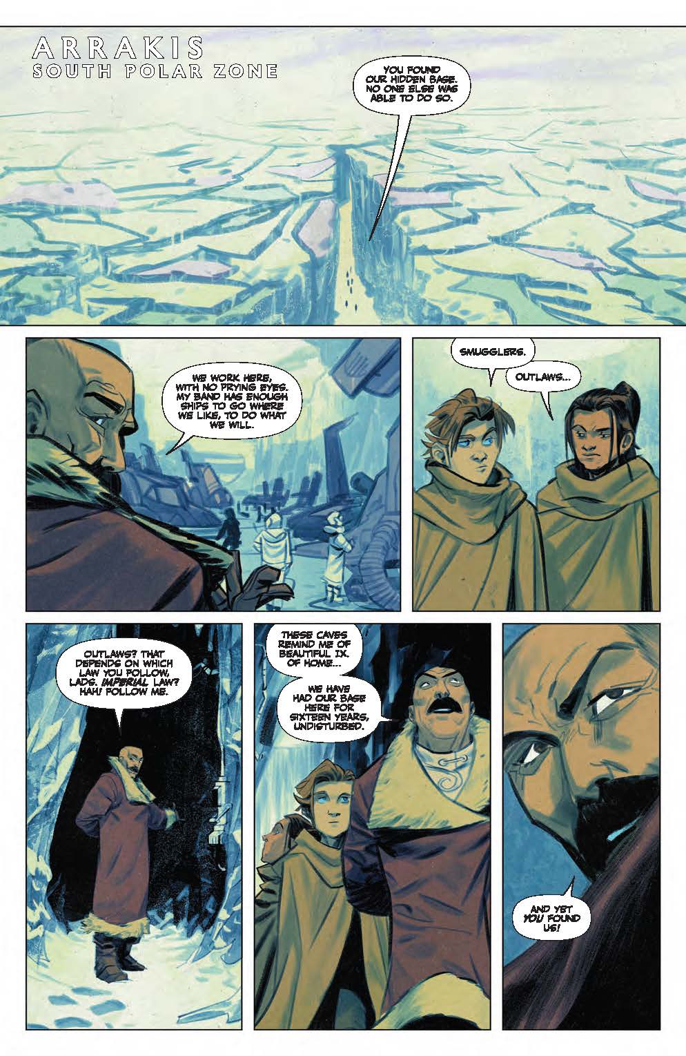 Quite possibly adding to this disconcerting avalanche of figures and affairs from Frank Herbert’s feudal interstellar society is artist Fran Galan, who frustratingly appears as just another in an increasingly protracted line of contributing illustrators for this mini-series. Slightly stiff when it comes to drawing the physical movement of this comic’s considerable cast, the Spaniard’s proficient pencilling itself is not really the problem though. But rather his ‘take’ on the appearance of certain individuals, which will doubtless cause some fans to initially rely upon this publication’s text to inform them as to just who it is being depicted in the panels – most notably Gurney, who repeatedly seems to either age or rejuvenate his looks depending upon what activity the “talented minstrel” is sketched performing.