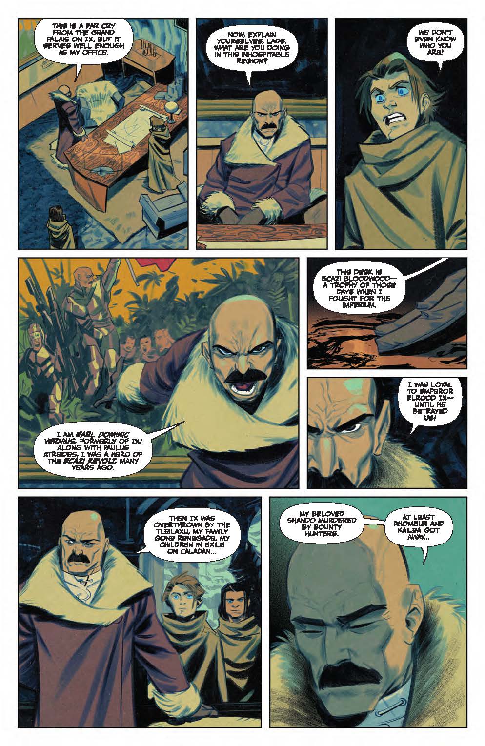 Having started this comic with a fast-paced opening involving young Gurney Halleck staging a tense rescue mission inside a depraved Pleasure House on Giedi Prime, it is hard not to imagine some within this book’s audience becoming a little despondent at the sedentary storytelling which follows. Sure, the subsequent seemingly inescapable fate of little Victor Atreides to fall before the charge of a gigantic Elecran should definitely grab all but the most cold-hearted of bibliophiles by the throat, especially when the tiny boy’s bodyguards declare their inability to protect the first son of Caladan’s duke from so deadly a sea mammal. Yet even this devastatingly dramatic near miss is quickly engulfed by the co-authors’ determination to cram in as many other locations, personalities, and dialogue-driven predicaments as the twenty-two-page periodical will allow.