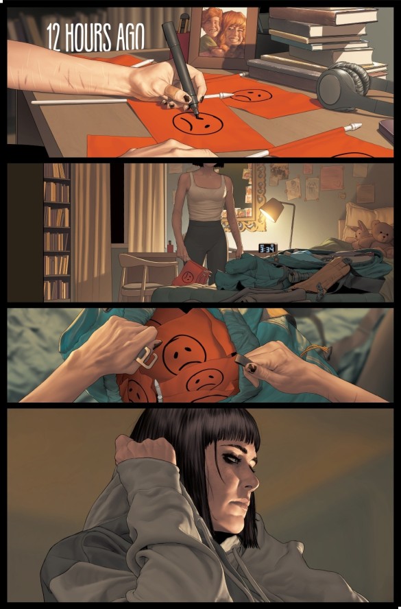 I’m a huge fan of Thomson’s narrative approach here, where she drip-feeds the reader with plot points and character information rather than slapping them in the face with a massive, unwieldy exposition dump. And this first issue is all about character, presenting us with a shocking situation before rewinding twelve hours into the past and letting us get to know the people involved a little better. Each of the five friends is intriguing in their own way, with Cleo – the mastermind of the operation – definitely standing out with her tumultuous past and possibly dishonest motivations.