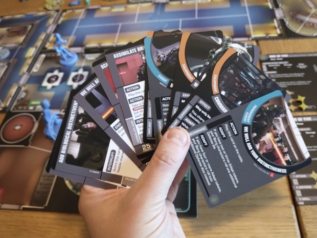 The decks are preconstructed (20 of each card type) but an additional set of cards allow you to customise, for example leaning into Captain Riker giving bonus orders or a much more aggressive, annihilating Borg approach. It’s this that keeps the game fresh and stand up to repeat play – never mind the fact that you can easily get a game done in an hour!