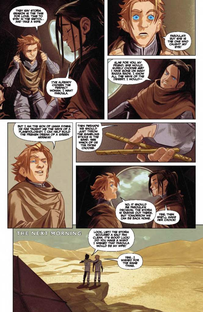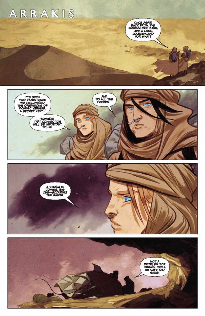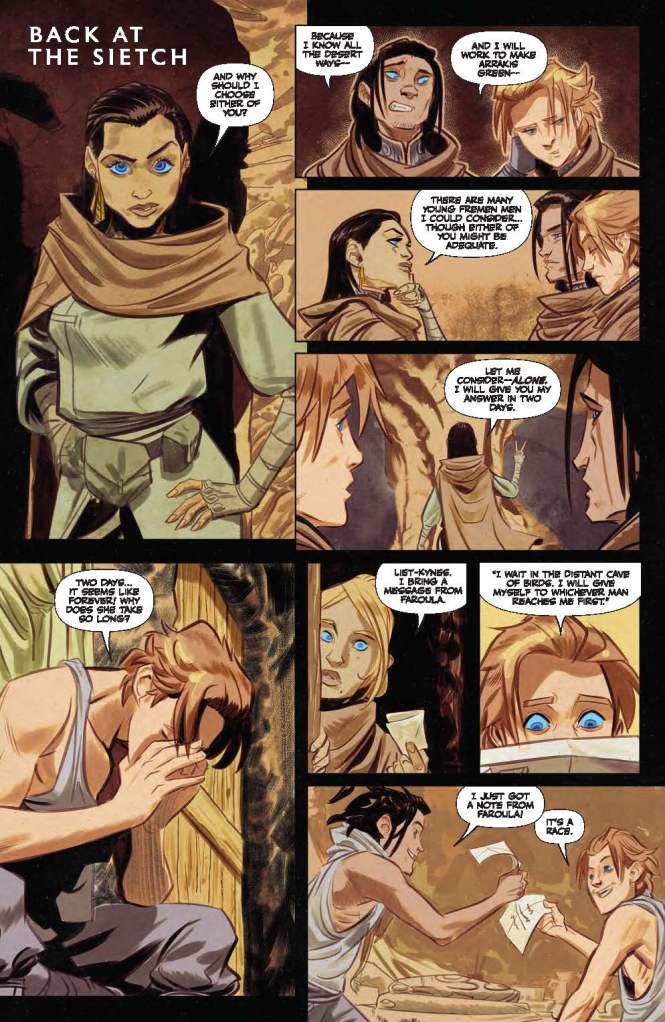 Foremost of these continuum conundrums is the events taking place inside Castle Caladan. The publication’s narrative has potentially already been moved on by eighteen months following its opening scenes set upon Arrakis. However, Jessica states she has only been assigned to Leto Atreides for six weeks since she was first introduced to the great house, and resultantly is “still learning the household, the people, the relationships.” However, Kailea then later accuses the Red Duke of having an affair with Baron Vladimir Harkonnen’s daughter at some point during the past couple of years, so it’s difficult to say when this important argument actually occurs in relation to the Bene Gesserit’s aforementioned earlier sequence and the surrounding events depicted upon other worlds.