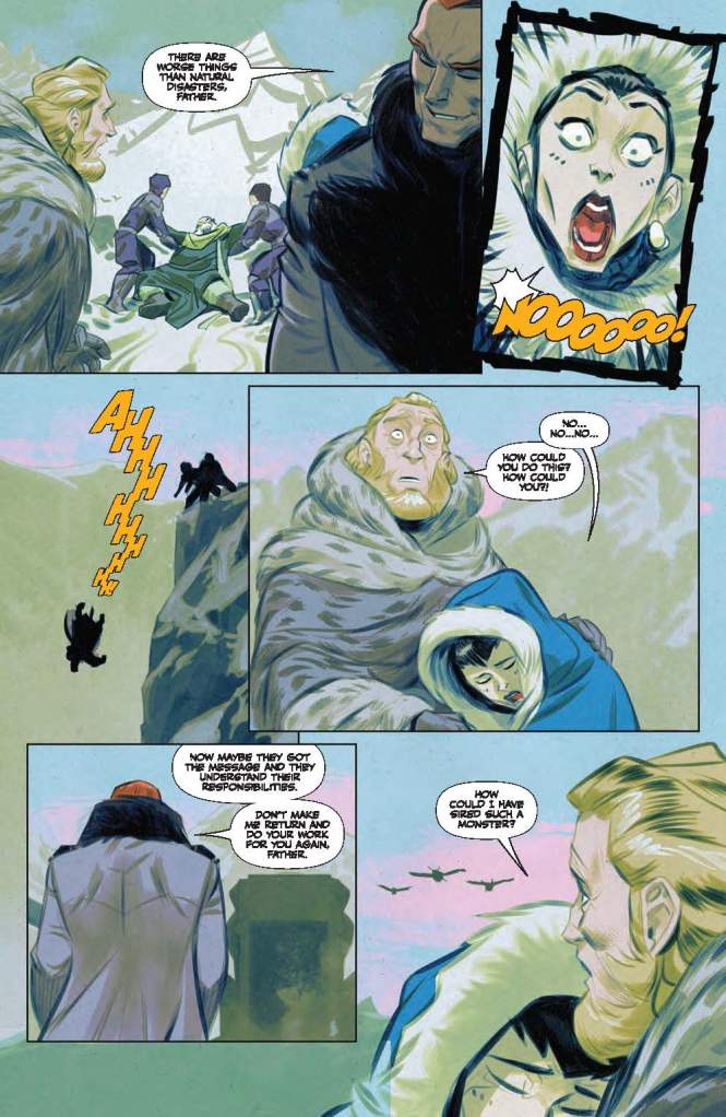 Perhaps therefore the sole success of this mini-series’ sixth instalment lies within the layouts of Fran Galan, whose consistently prodigious pencilling at least manages to gel everything together into a harmonious looking feast for the eyes. Galan is particularly good at depicting each figure’s emotions on their faces, with Leto’s angry and utterly exhausted looks at the ever-antagonistic mother of his child telling the audience everything it needs to know about his feelings for the infuriating woman.