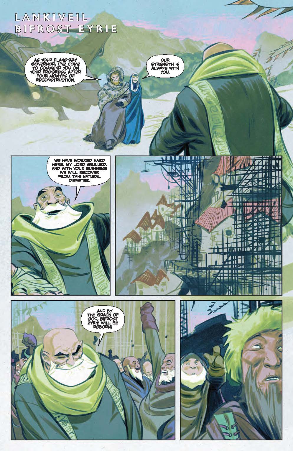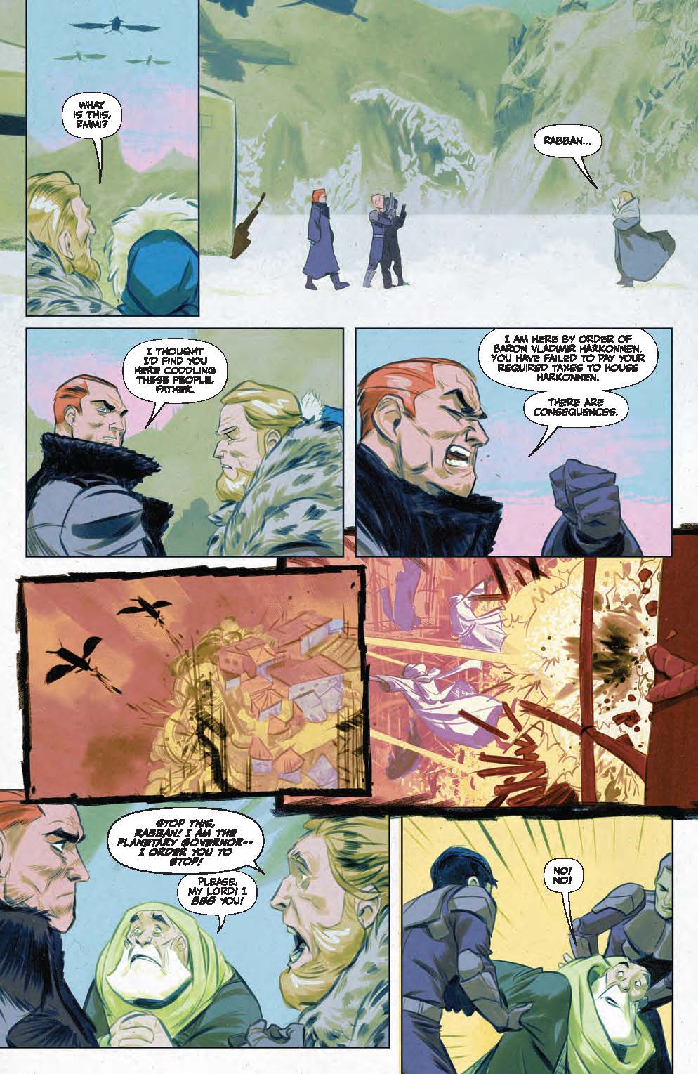 Of course, considering just how many characters within this comic’s considerably sized cast repeatedly mention events moving on ‘a year and a half’, the writers could have simply pushed everything in this book forward by that amount of time simultaneously. However, if that’s the case it has been very clumsily implemented, as at Lankiveil the audience are shown Rabban mercilessly destroying the settlement’s reconstruction some four months after its inhabitants first started repairs, before being hurled the obligatory eighteen months into the future and are then pushed a further eight weeks forwards to see Lord Abulurd’s wife announce her surprising pregnancy.