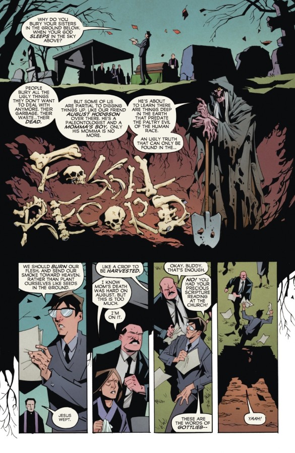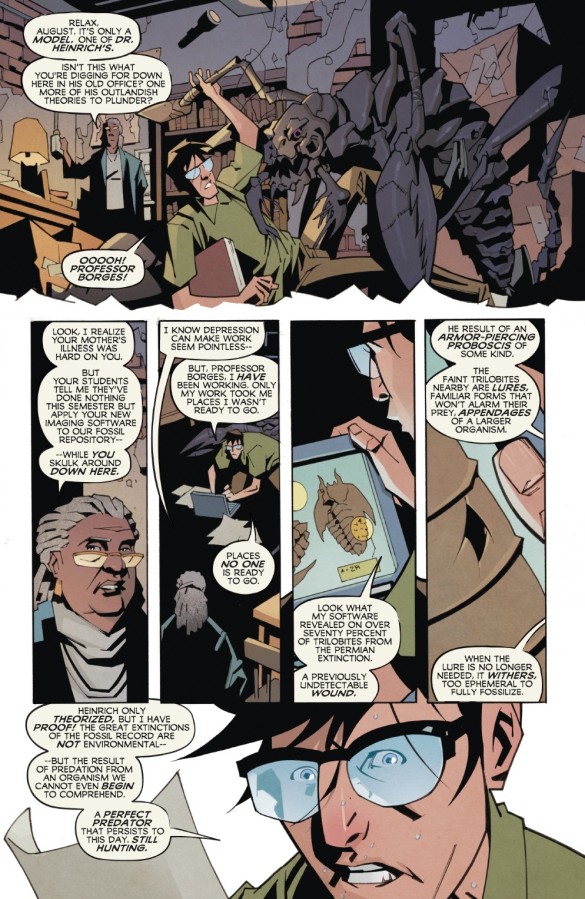 Slightly more ‘honourable to the genre’ is Phil Hester’s “Fossil Record”, which rather intriguingly follows a distraught palaeontologist down into deep madness following the death of the young man’s mother. Decidedly tongue-in-cheek, owing to both the clumsiness and excitability of August, the Iowa-born writer’s premise that a previously undetected species actually caused the great extinctions of the planet’s past makes for an intriguing read.