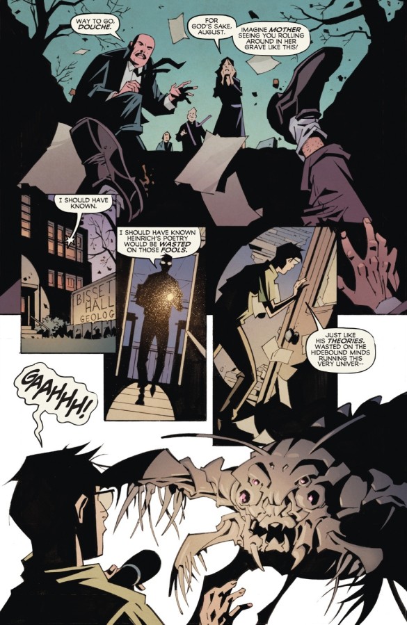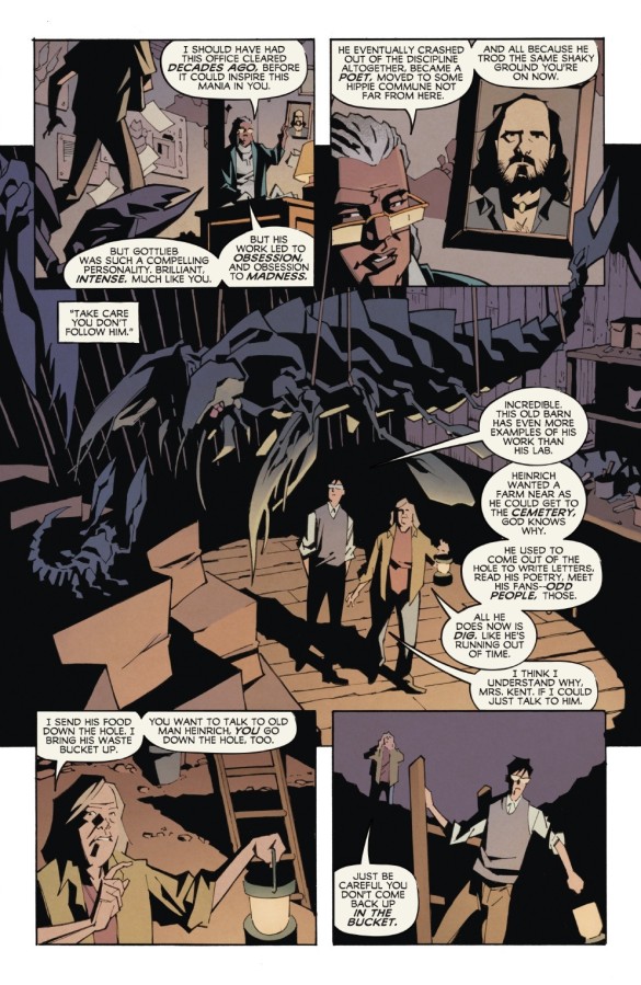 However, once the Eisner Award-nominee begins pencilling Professor Heinrich’s underground warren of hand-dug tunnels, things turn much more macabre, with the realisation that the killer species might actually have lured the mentally unstable protagonist to his doom, when it somehow realised he had discovered their shadowy presence. This change of pace is extremely well-penned and leads to an excellent zombie-filled chase back to the graveyard where the elderly Missus Hodgson was only recently buried.