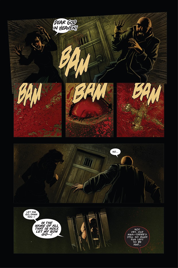 Speaking of the art, it’s lovely, but dark. I don’t just mean in terms of subject matter, with a variety of gore filled panels, but the overall look. Cormack uses lots of black and dark greys and blood reds. All incredibly complimentary for both the story’s setting and genre whilst providing better contrast when those splash panels pop off as Vieri confronts the demon in the cell. I’ll caveat by saying that I read this in electronic format so would be very keen to see the finished product in my hands and how this decision to have everything so dark holds up in the flesh as it were.