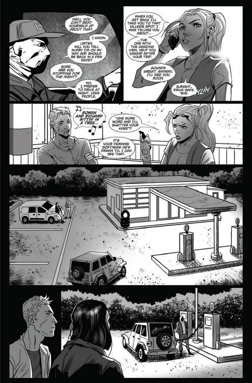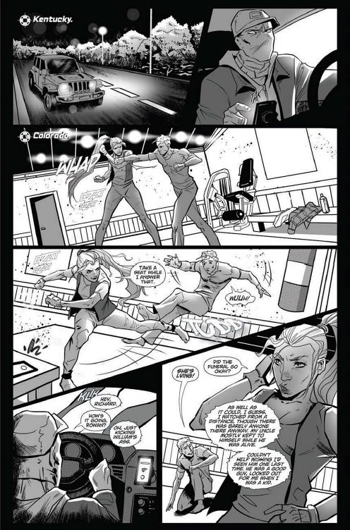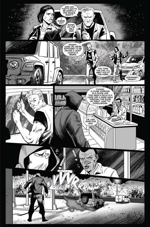 Equally as good at pencilling as De-Gruchy and Paige are story-telling is Igor Kurilin, whose black and white panels add a distinctly dark and foreboding night-time ambience to the publication’s layouts. The illustrator proves especially good at capturing all the last second decision-making that takes place within the former soldier’s mind, as events increasingly grow out-of-hand due to more and more of Conroy’s heavily-armed minions congregating upon his progressively perilous position outside a farmhouse.