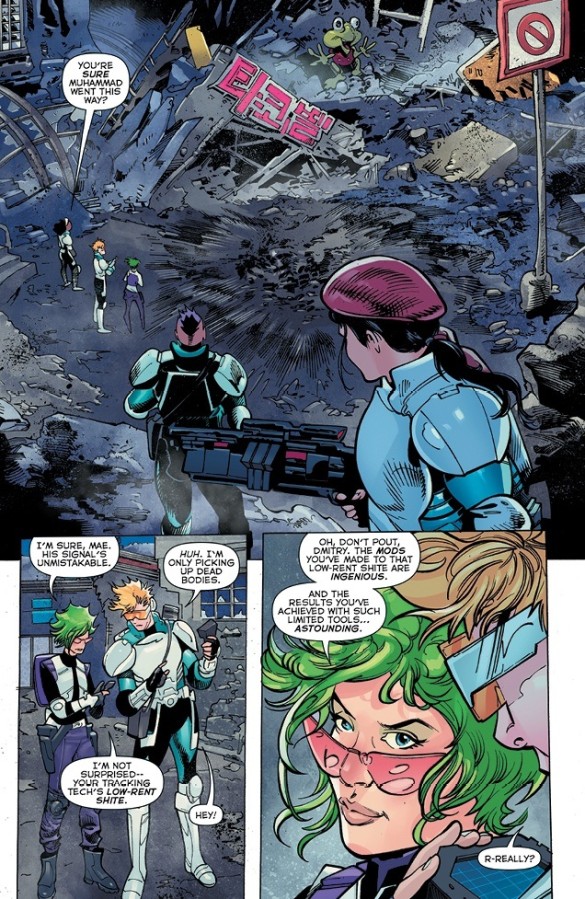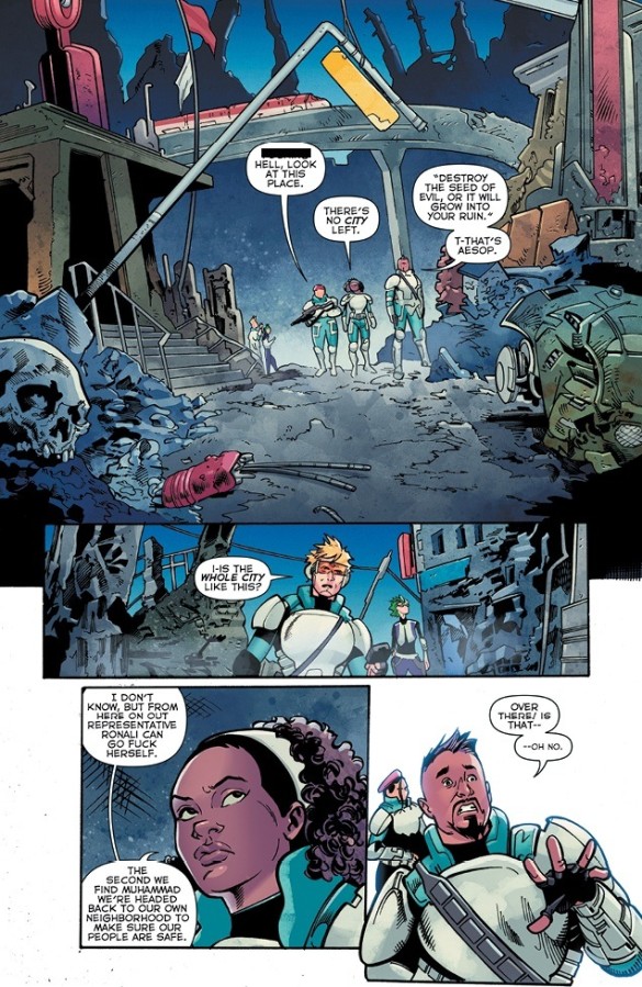 Instead, Ahmed decides to painfully pad out his twenty-two-page plot with the off-screen deaths of Paulo’s entire squad, the total destruction of Central Command and more swear words than you’ll find at a hospital’s overbooked midwifery unit. Such a technique genuinely proves incredibly frustrating and arguably lazy, especially when Cho’s homicidal rivals were at the forefront of this book’s narrative until an edition or two ago. Indeed, such an almost casual offloading of the thieving, scheming government contractors strongly suggests that the creative team suddenly found themselves with far less time to tell their story than they originally thought – something which also ties in with the publisher’s shock announcement that this title was now just going to be an eight-part mini-series.