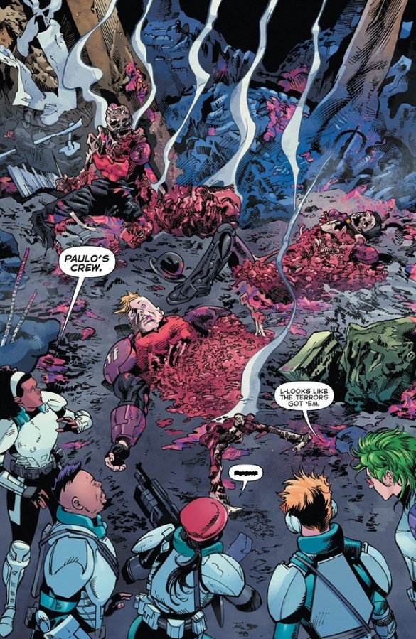 Just as peculiar though is the unexpected release of Muhammad by the Terrors themselves. The “mind-bending monsters” have clearly established some sort of psychic rapport with humanity’s apparent last hope, as seen by the man’s physical pain when he later witnesses one of his colleagues blast a phantasm to pieces. Yet just why the multitude of manifestations initially withdraw their pink-hued tentacles from his brain is never explained, and instead his escape is simply used by the secondary cast as an excuse to remind the reader that “Paulo’s people are dead”.