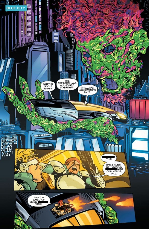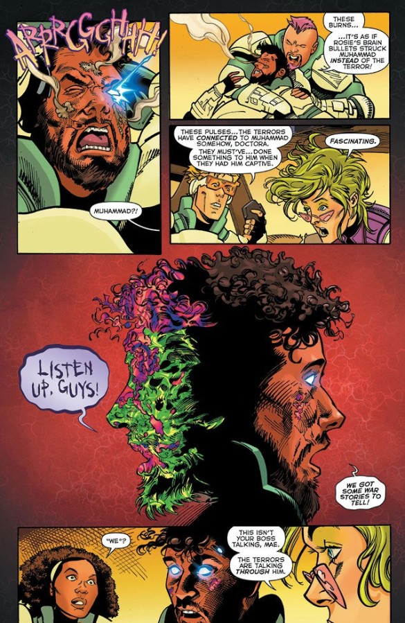 Waiting until this comic’s very end before presenting its readers with any sort of noticeable action, Saladin Ahmed’s narrative for issue seven of Terrorwar is arguably something of a slog. Indeed, for those bibliophiles willing to wade through the cast’s consistent swearing and profanities, there’s still sadly not much storytelling to enjoy until Doctora Z casually allows Muhammad Cho’s team to waltz straight into Representative Ronali’s supposedly impregnable flying fortress in an attempt to sabotage Blue City’s power grid.