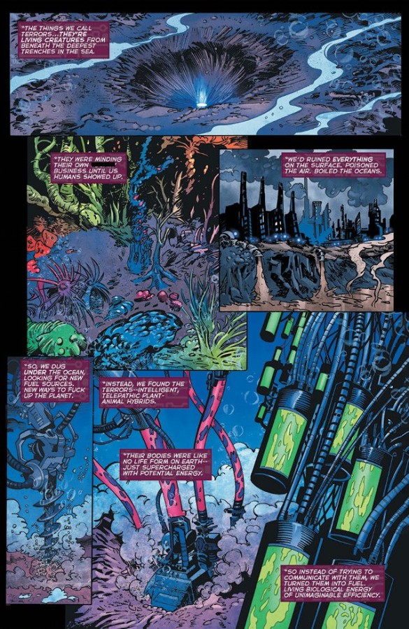 Before this cliffhanger of a conclusion, all Ahmed pens is a strange row between the dishevelled contractors about who is willing to sacrifice everything in order to save Humanity, and somewhat surprisingly, which of the Terrorfighters selfishly just want to return to their loved ones before civilisation’s end. These arguments are debatably rather illogical considering that all of Cho’s comrades-in-arms now realise the psychic manifestations are actually helpless sentient lifeforms knowingly being turned into liquid fuel by the powers that be, and have seen first-hand the devastation the surviving creatures will cause in their desperate attempt to throw off their mass-murderer’s chains.