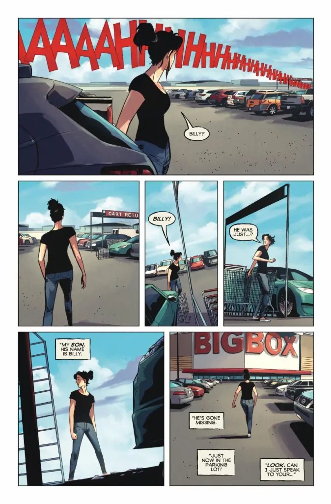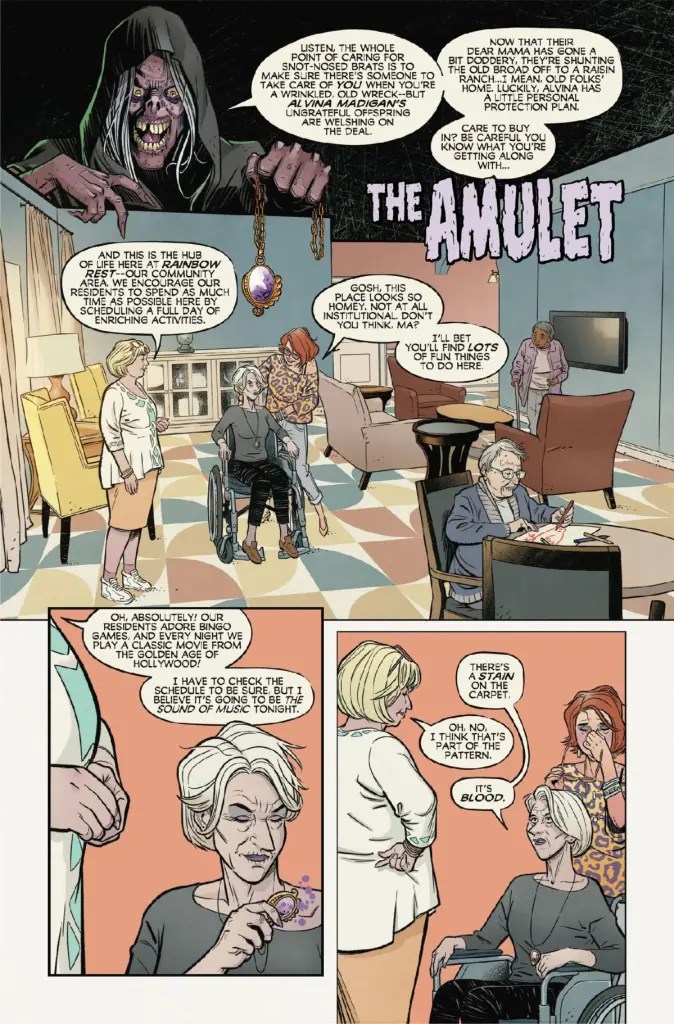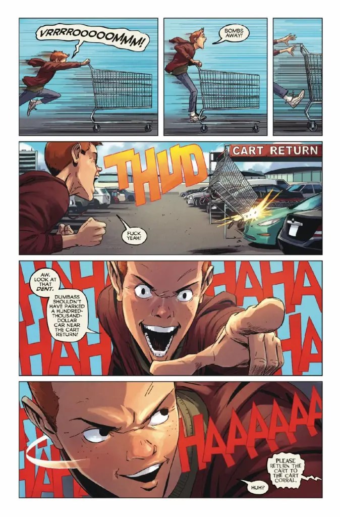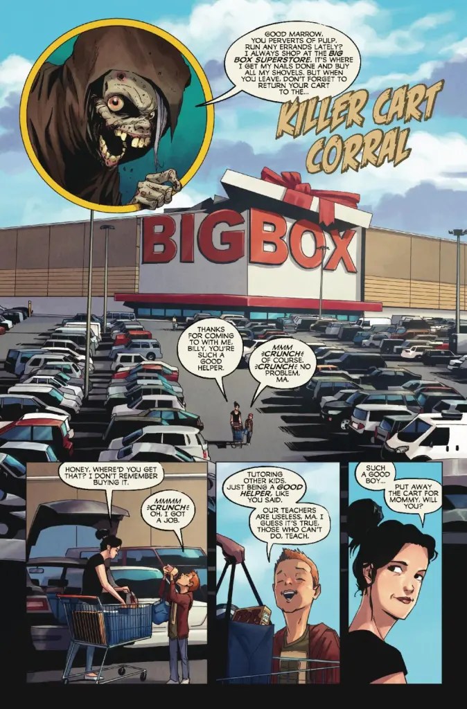 Capturing both the wicked wit and grotesque gruesomeness of the original 1982 horror anthology film “Creepshow”, Nick Dragotta’s opening narrative for issue four of this comic book mini-series should certainly catch many a reader off-guard with its rapid decline into savage, physical mutilation. In fact, the “naughty” creator’s Killer Cart Corral may very well completely wrong-foot the majority of this publication’s audience, courtesy of a storyline which initially suggests that a haunted shopping trolley will be its central antagonist, and then shockingly revealing a far grisly monster to break Billy’s heavily traumatised mother into several pieces.