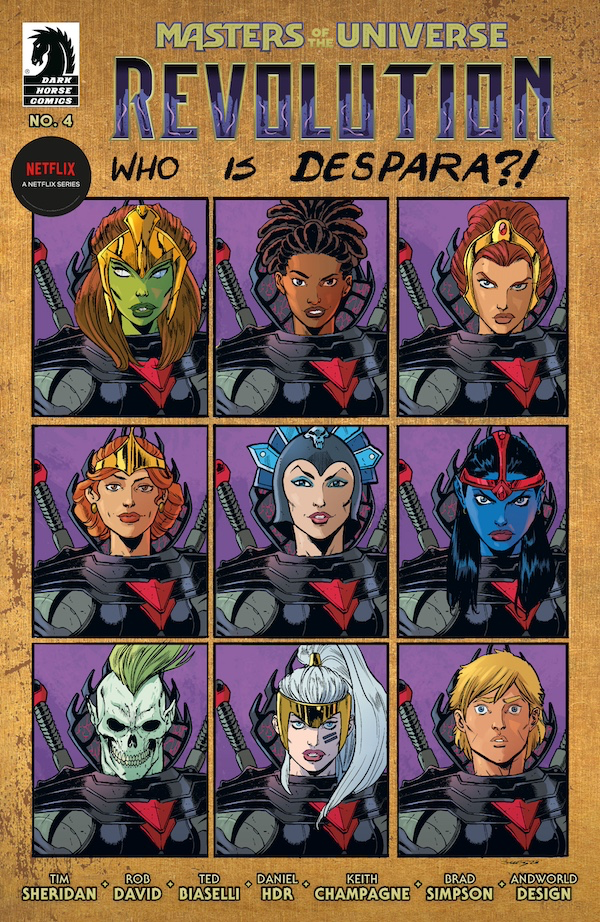 Not only that, but to celebrate the release of Masters of the Universe: Revolution, produced by Mattel Television Studios and premiering on Netflix January 25, Dark Horse Comics and Mattel have also unveiled the artwork for a special variant cover that will be featured on issue #4. This variant cover, illustrated by Masters of the Universe veteran Tim Seeley and colored by Brad Simpson, highlights a variety of characters from the animated show and asks the question “who is Despara?”