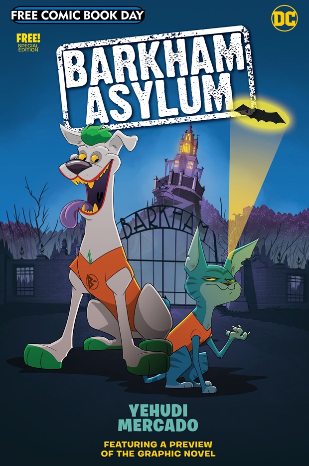 In Barkham Asylum (ISBN 9781779505002), when the Super-Villains of Gotham get thrown into Arkham Asylum, their henchpets go to the maximum-security pound known as Barkham Asylum. Fur flies when Jester, The Joker’s dog, gets a tough-talking stray cat named Penny tossed into lockup with him. But they’ll have to work together to figure out what the evil Dr. Hugo Mange is up to. And the only way to stop this terrifying team-up is to win the talent show and get visitation with their masters at Arkham on the hill. Because The Joker is sure to help! What could go wrong with that plan? DC’s Barkam Asylum Free Comic Book Day Special Edition includes a chapter of the new middle grade graphic novel created by writer and artist Yehudi Mercado. Don’t miss the mischievous pets of Gotham’s Super-Villains in an escape adventure!