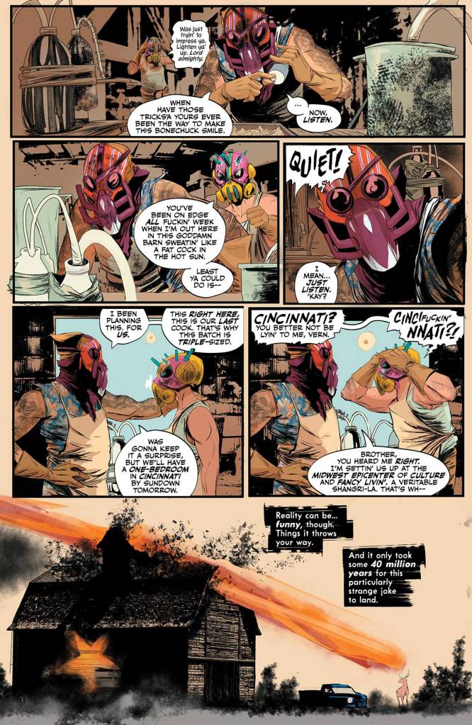 Elwood and Vernon Damnage are a couple 0f meth cookers from Golgotha Knob, Kentucky. An undeniably likeable pair of rednecks with a Lennie and George dynamic, their plans to save enough cash to relocate to the Cincinnati, the “epicentre of culture and fancy living”, are scuppered quite spectacularly when a chunk of interstellar space rock comes crashing through the roof of their meth lab, destroying their latest batch.