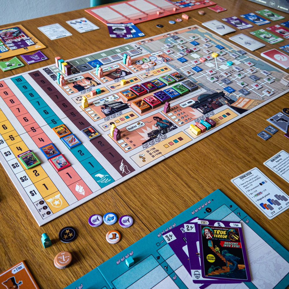Each comic has a distinct genre (superheroes, horror, romance, crime, sci-fi or Western) and requires a writer/artist creative team in order for it to be published (sorry letterers and colourists!) Players have a variety of actions they can assign meeples/editors to every turn, including hiring creatives, developing comics and comic ideas, collecting royalties and hitting the streets of New York to collect and fulfil sales orders.