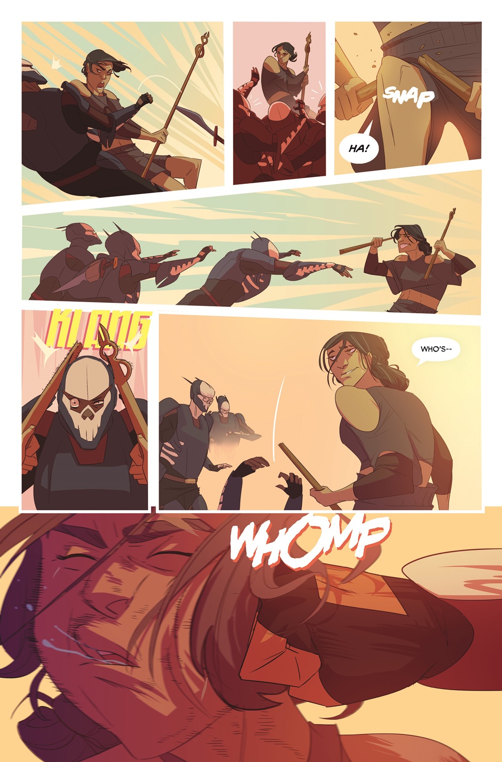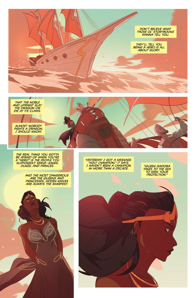 Writer Whitley brings a lot of established tropes and genres together here, weaving them around an utterly fascinating protagonist in Noelani – a grizzled former knight who has been living at the bottom of a bottle since the “inappropriate” romance with the Queen she was sworn to protect led to her being exiled from the kingdom. Her relationship with Isadora provides a lot of the narrative thrust of the story as they battle to balance the complicated feelings they clearly have for one another with the urgency of trying to locate the seemingly kidnapped princess.