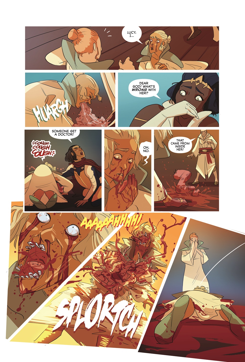 While the cover and interior artwork gives a distinctly all-ages vibe, this self-contained graphic novel is actually anything but. Boasting profanity, nudity and brutal violence (including poor handmaidens being turned inside out by dark magical forces, as you can see in the preview below), this is a distinctly adult tale that perfectly bridges the gap between queer romance and gritty detective noir.