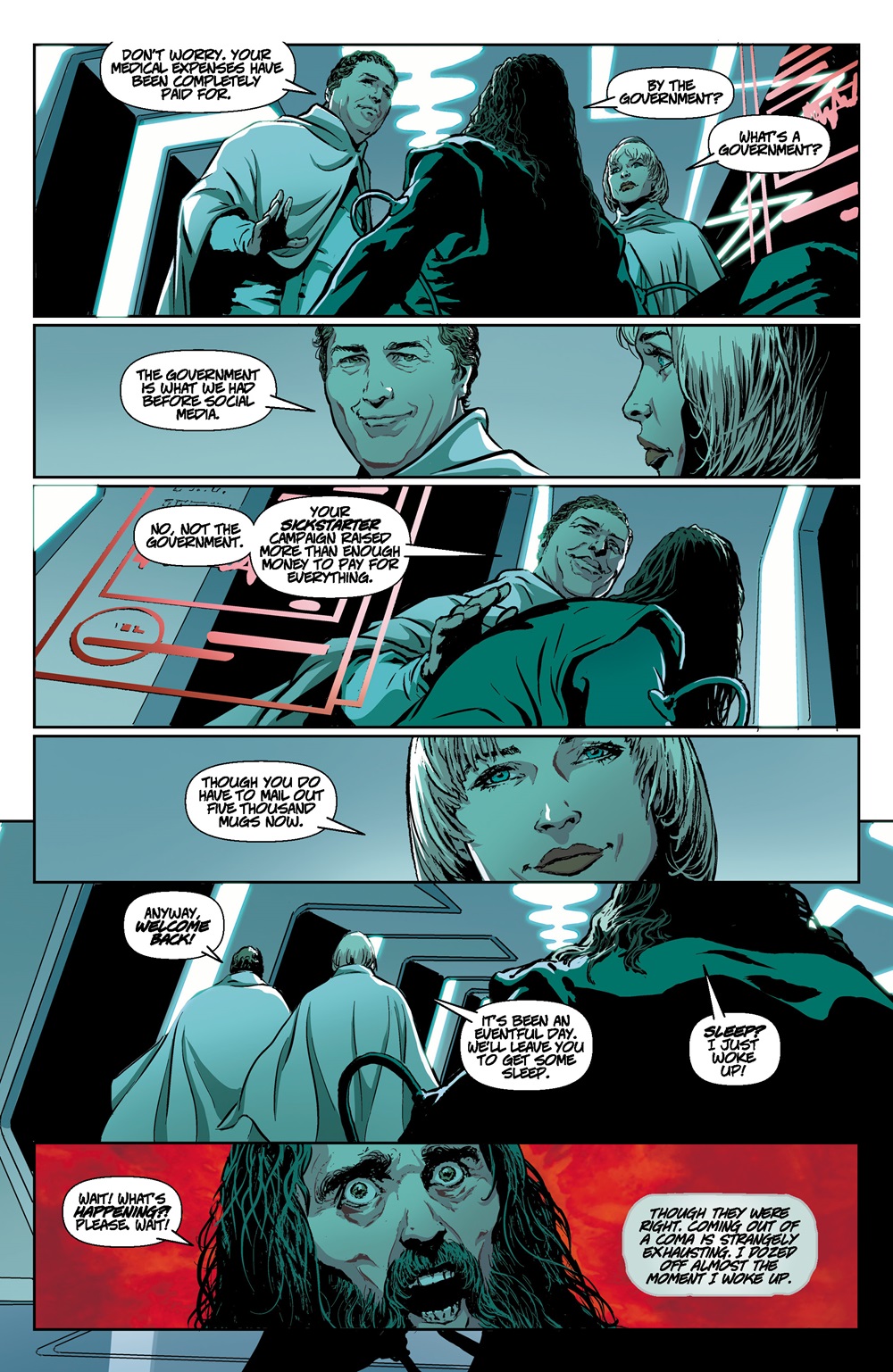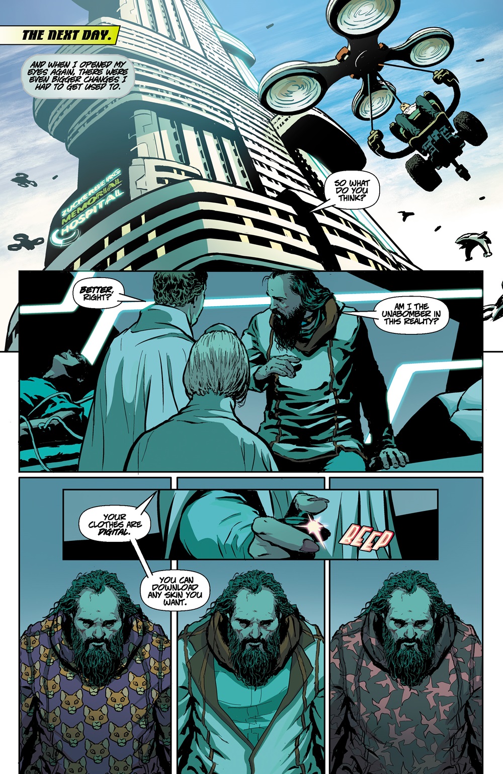 Arnold plays the role of “us” in this social media hellscape, equal parts bewildered and horrified by every new discovery, but still finding a way to gradually get to grips with this toxic new status quo. Adding an interesting wrinkle to the proceedings is Ellen, Arthur’s sadly deceased girlfriend (hashtag Ellen) who perished in the Social Media Wars around five years into his coma, and whose presence features heavily in this twisting, turning 38-page story.