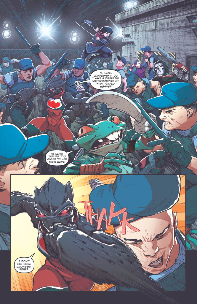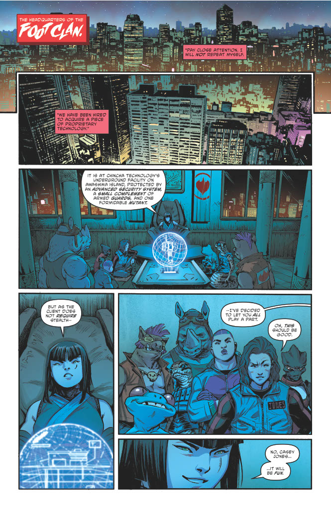 Over a decade removed from their stellar four-part “The Secret History of the Foot Clan” mini-series. Erik Burnham and Mateus Santolouco are back with an in-depth look at everyone’s favourite (or possibly second favourite, depending on your personal affection for the Man Without Fear) hooded ninja group. A lot has changed in the ten-plus years that have passed, with Oroku Karai taking over the leadership of the group from her grandfather Oroku Saki, AKA the O.G. Shredder. And in this blisteringly fast-paced first issue, we join Karai and a group of the Foot’s best and brightest – including Bebob, Rocksteady, Casey Jones, Natsu and others – as they engage in a little ‘work for hire’ by breaking into a well-guarded facility to steal some high-grade tech for a client.