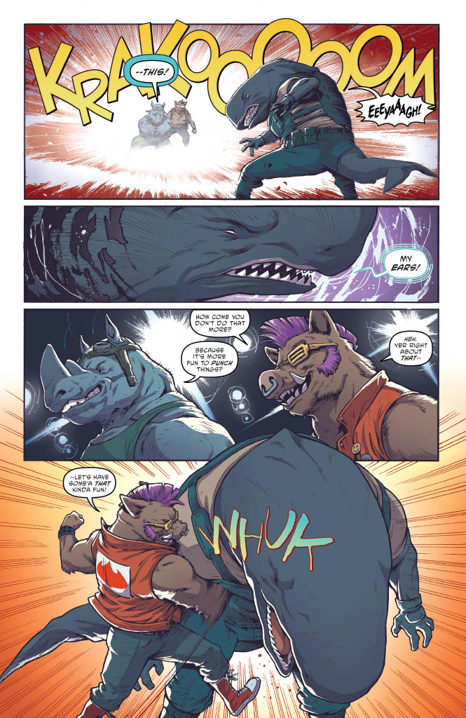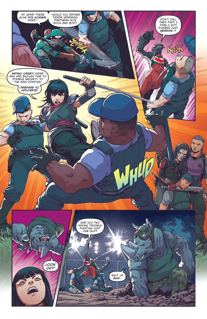 It’s a fantastic way to kickstart the series, dropping us right into the action and letting us not only see how formidable the various members of the Clan are, but also how they interact with one another. Unfortunately, their mission is interrupted by a pair of cybernetically-enhanced ninja from the “Dog Star Clan” who easily dispatch them, beating Karai into a bloody pulp before leaving with the tech. It seems there’s a new group in town, and that this series will feature the Foot Clan, and Karai in particular, trying to find a way to overcome both these powerful adversaries and their own arrogance.