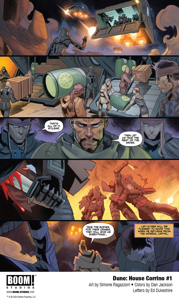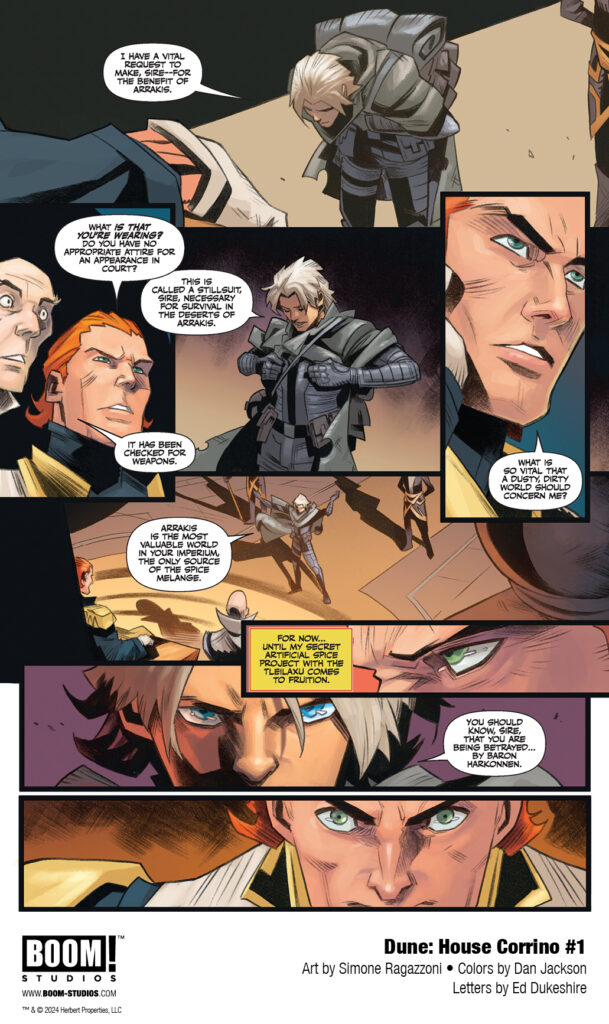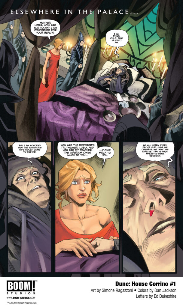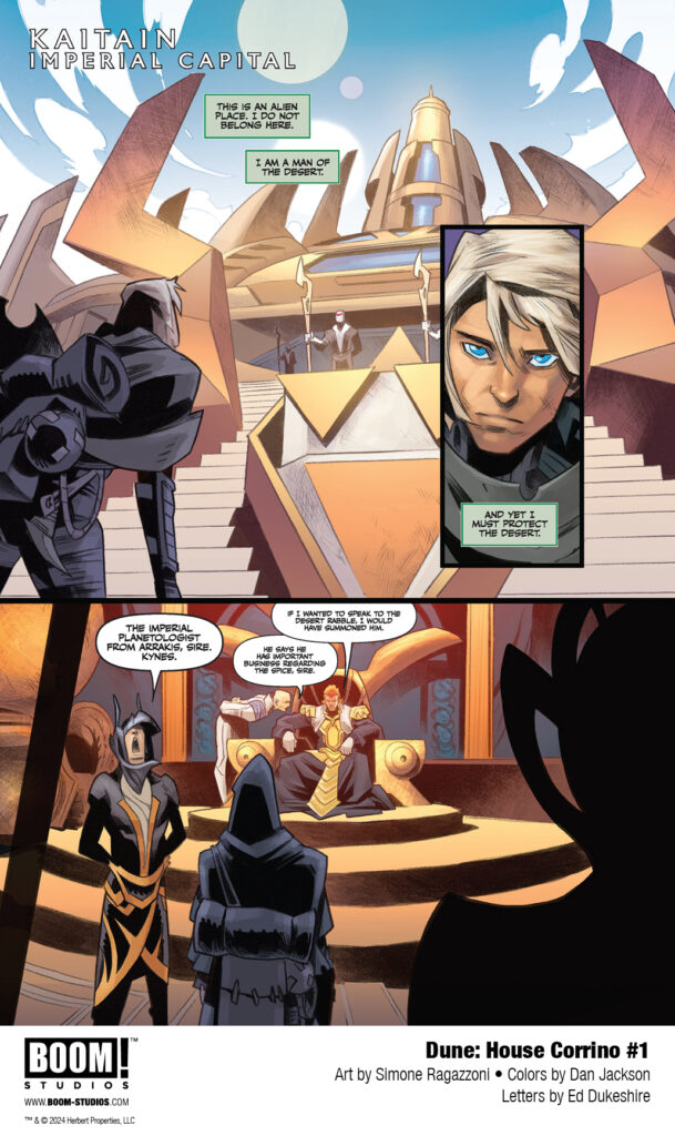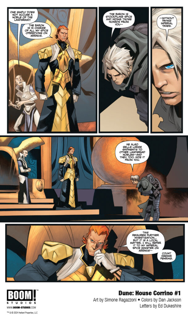 Described by its Los Angeles-based publisher as “unveiling a closer look at the rising conflict between beloved characters and bitter villains”, this first issue of Dune: House Corrino is arguably a comic book adaption which will only be understood by bibliophiles already heavily familiar with the science fiction franchise created by Frank Herbert, and later expanded upon by award-winning novelists Brian Herbert and Kevin J. Anderson. Indeed, without such prior knowledge its genuinely hard to imagine any reader successfully navigating their way through this thirty-three-page deep-dive into the very heart of the dystopian future’s incredibly complicated universe; “We hatched this plan decades ago, Hasimir, after we tricked father. It has been too long!”