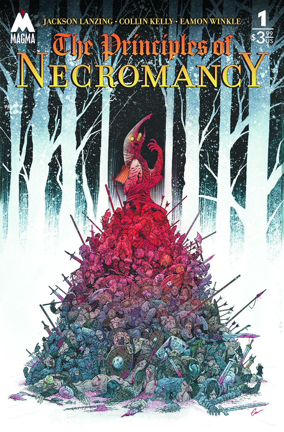 On sale this week as part of new publisher Magma Comix’s first slate of comic book releases, The Principles of Necromancy sees acclaimed writers Collin Kelly and Jackson Lanzing (aka “Hivemind”) teaming up with rising star artist Eamon Winkle to introduce us to the world of Doctor Jakob Eyes, the world’s first necromancer.