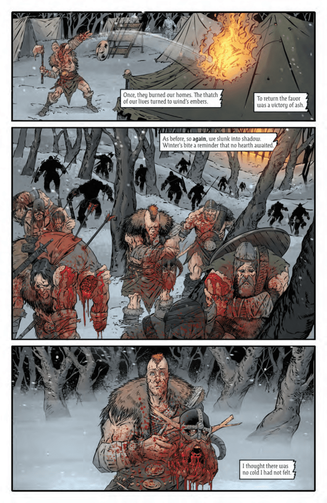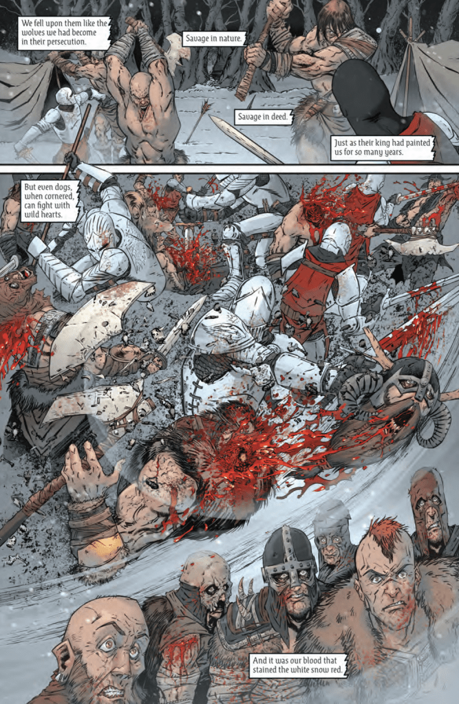 On the visual side of things, Winkle (who I’ll admit to not having any prior knowledge of) absolutely knocks it out of the park, seamlessly transitioning from fairly traditional fantasy bloodletting to eye-widening moments of pure unadulterated body horror. The level of detail on display is impressive, and colourist Jay Fotos does a great job of underscoring the more gruesome visual moments with flashes of crimson amidst the otherwise gray and washed-out backdrop. For a story like this, it’s vitally important that the visual horror lands effectively, and whether it’s stitched-together monstrosities or Doctor Eyes’ horrifyingly grotesque take on a “plague mask”, it’s safe to say that the artistic team more than hold up their end of the bargain here.