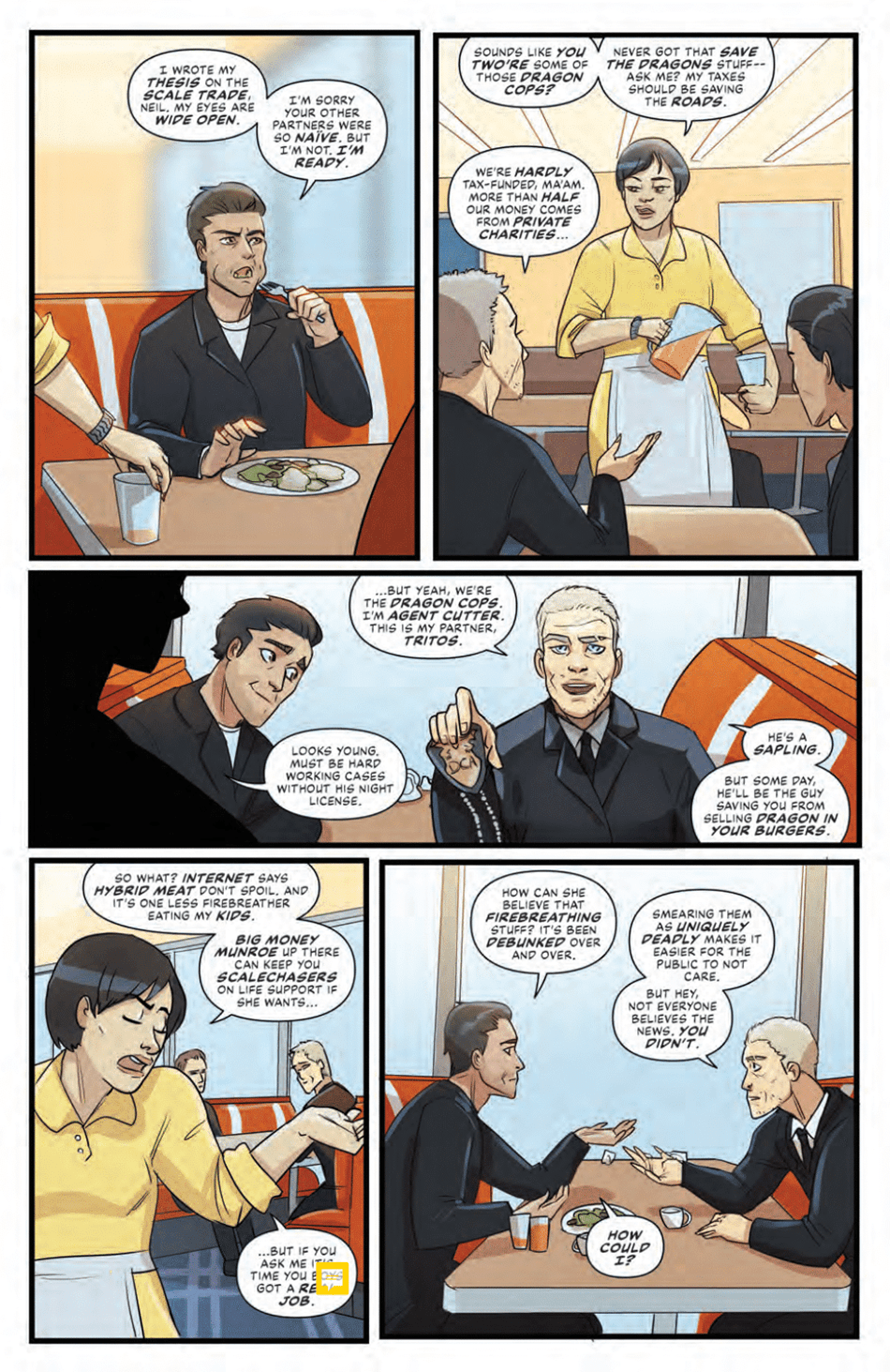 Huang’s lively, colourful and slightly cartoony artwork initially suggests a slightly more whimsical take on this high-concept premise, but it soon becomes apparent – as Triton and Cutter stumble onto a suspected operation where dragons are being killed and processed – that this is a far darker story than I think a lot of readers may have been expecting. Indeed, as Triton’s incandescent fury at what he’s witnessing leads to a wildly violent outburst and Cutter immediately following suit, Huang brings this shocking shift in tone to the page with a real flair.