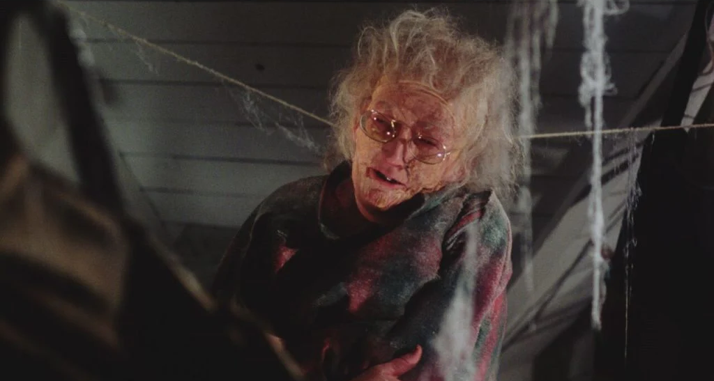 The bad acting in horror movies can sometimes create an almost endearing quality to the characters. In Cathy’s Curse, Agatha the medium played by Mary Morter has the best sequence in the entire movie. Agatha discovers the possessed Cathy in the attic. Cathy conjures an evil, more decrepit version of Agatha who acts as a harbinger to the medium. Considering how the evil twin speaks down to her normal self, I found myself wondering if the demon/ghost was toying with her or was it genuinely trying to warn Agatha?