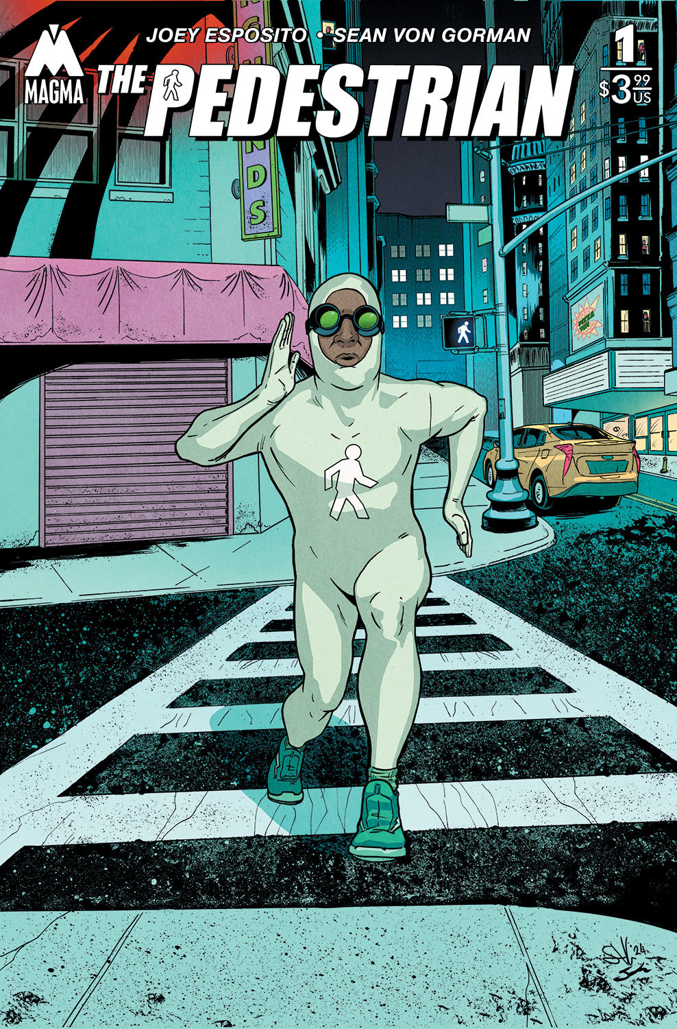The Pedestrian, on sale now from Magma Comix, takes us to the sleepy streets of Summer City and introduces us to a strange, silent, speed-walking vigilante. Yeah, you heard me.