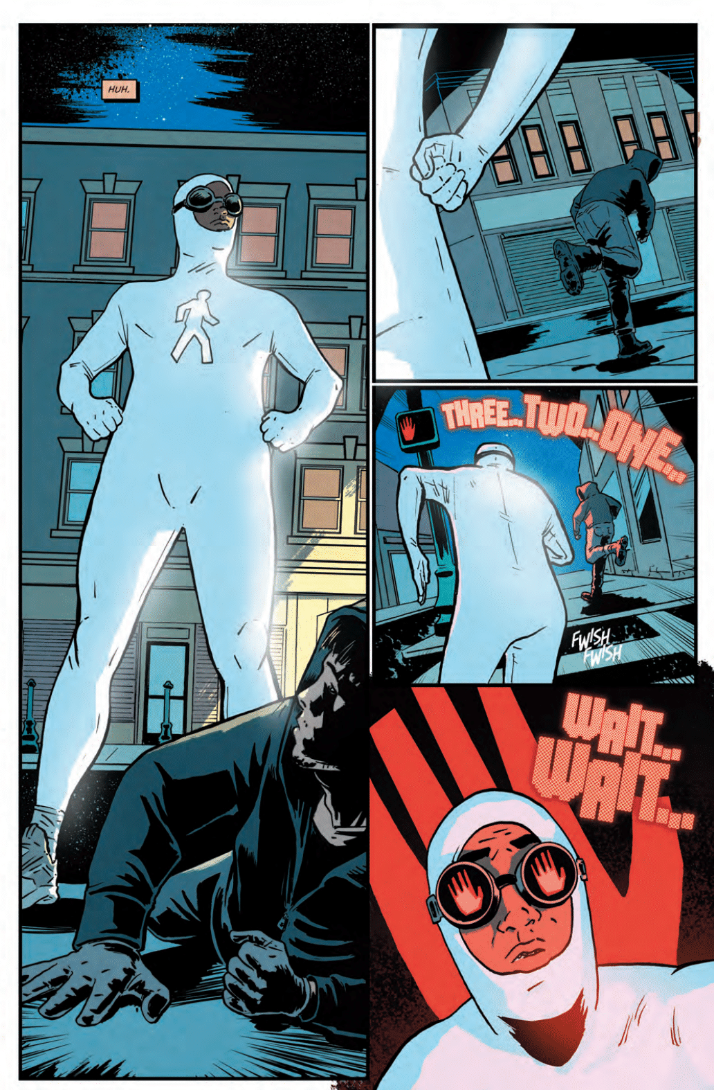 Von Gorman does a solid job with the artwork, as anyone familiar with his impressive portfolio of work will have been expecting, letting us sink into the streets of Summer City gradually while juxtaposing its fairly regular-looking inhabitants with this absurd, speed-walking vigilante as he fwishfwishfwish’es his way from crime to crime. Given the fairly grounded nature of the story there isn’t too much in the way of grand superhero flair to this point, although the brief snapshot of the aforementioned nemesis is well delivered, with colourist Josh Jensen really helping that particular splash page to pop.