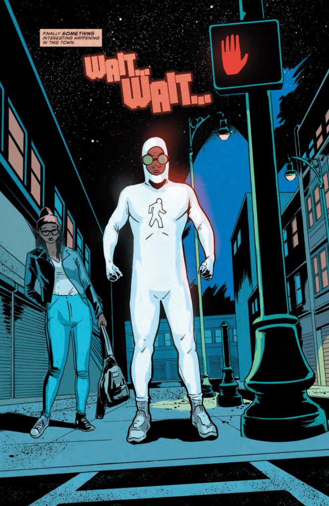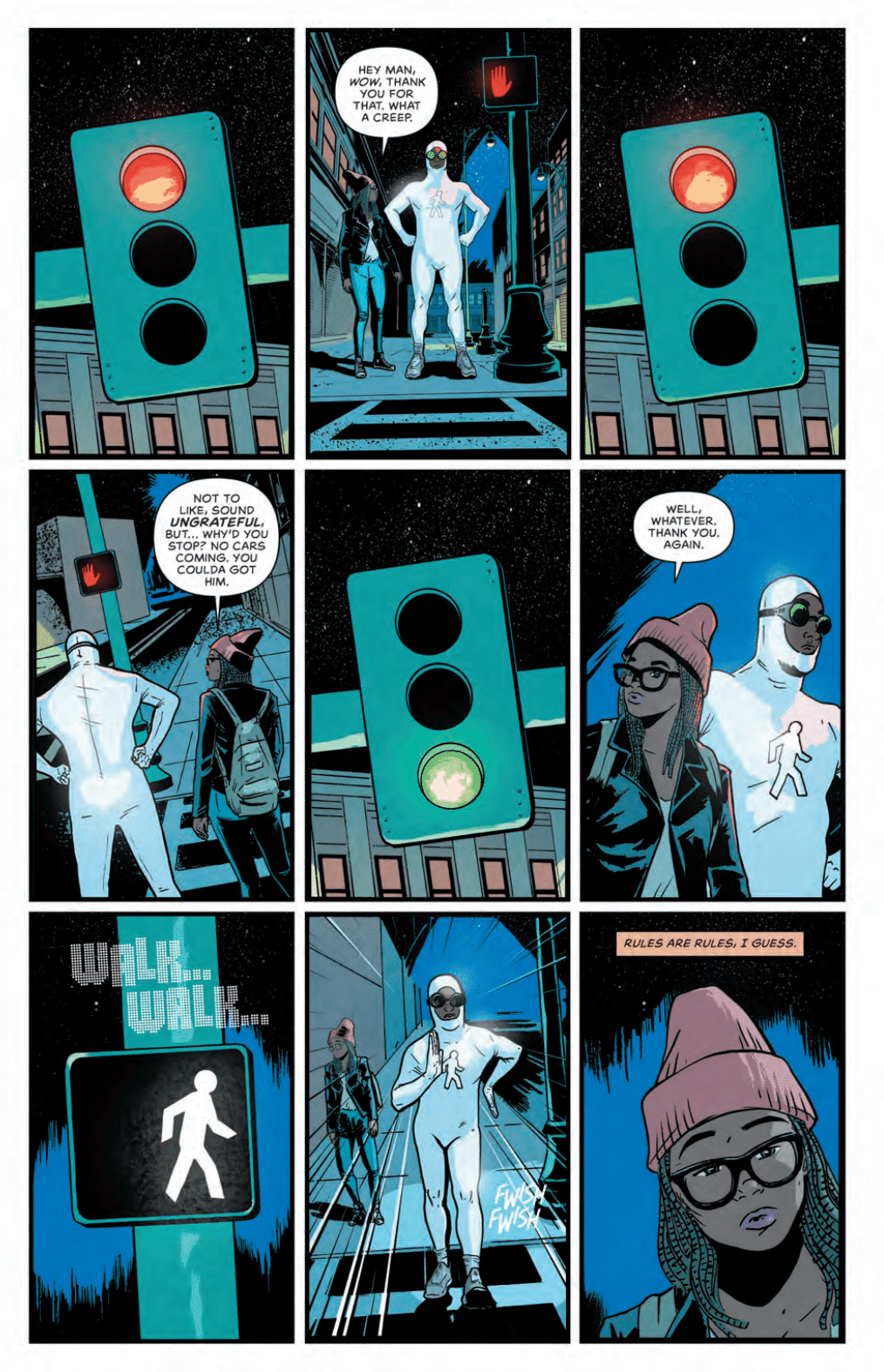 Okay, so there’s obviously a lot more of this story still waiting to be told than what we get in this first, but as an attention-grabbing hook, this first issue does exactly what it needs to do. Esposito adopts a slow-burning approach here, gradually introducing us to the world of the Pedestrian and presenting us with an ensemble cast of intriguing characters. There’s also something a little more sinister lurking in the shadows, and possibly a traffic light-themed nemesis for our titular hero, but we’re taking our time getting there, an approach I’m firmly in favour of.