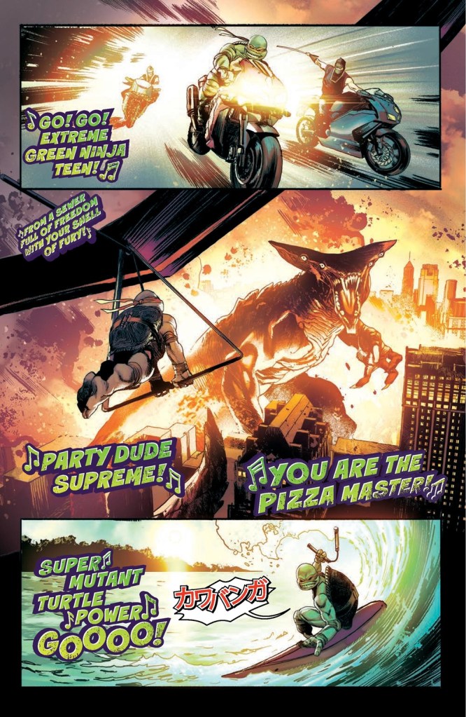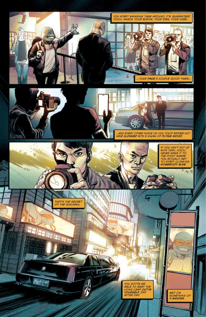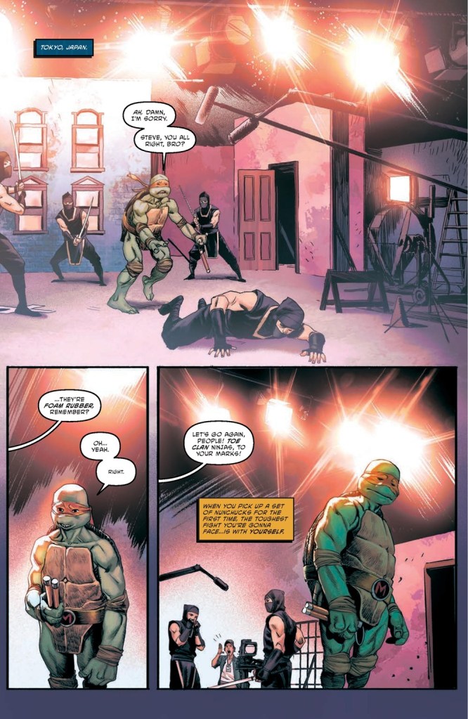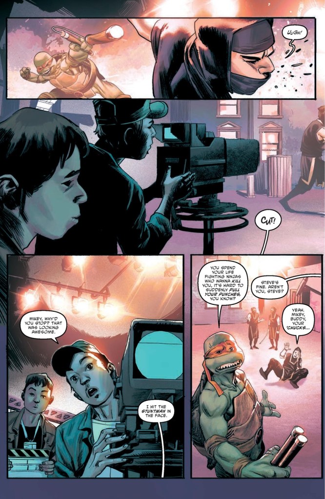 As with the previous issue, Mikey’s new status quo is unceremoniously shattered by the arrival of the resurgent Foot Clan, seemingly hell-bent on putting him down for good. This whole sequence is pure gold, and watching him gradually shift from playing a ‘fake ninja’ on TV to remembering what it’s like to be a real one is likely to have any self-respecting TMNT fan grinning from ear to ear.