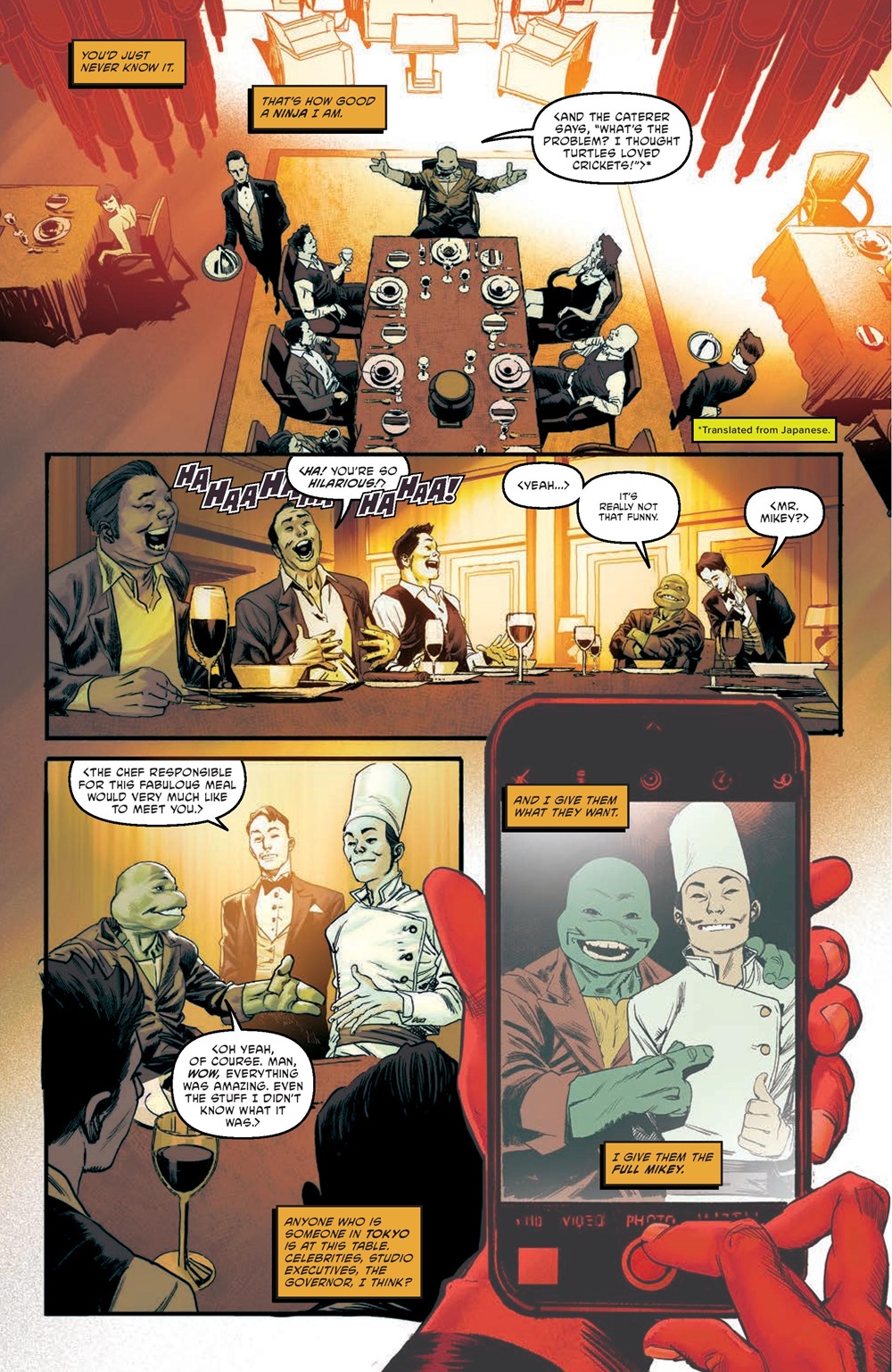 When we pick things up here, Mikey has become something of a local celebrity in Tokyo by virtue of his starring role in Japan’s hottest new TV series. Everyone wants a piece of him, and while the always fun-loving Ninja Turtle appears to be enjoying himself on the surface, he’s clearly struggling with the fakeness of this new world he finds himself inhabiting. Much like the previous issue, Aaron juxtaposes the present day with ‘fonder memories’ of the four brothers together, and while it’s obvious Mikey is still harbouring a lot of deep-rooted resentment for the way things ended, it’s hard for him to stop himself pining for simpler times.