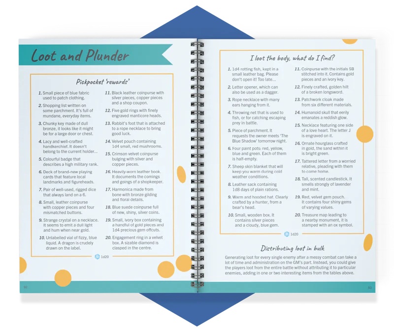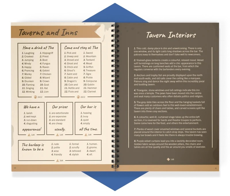 Looking for a name, appearance, motivation and career history for the randomly-inserted background NPC that the party now apparently wants to know everything about? Fire up the D20s and this book will sort you out. Want a name, musical style and instrument choice for the band playing in the corner of the tavern your heroes find themselves in? Sorted. Need to spice up a particularly dramatic natural 20 during a climactic combat sequence? Done!