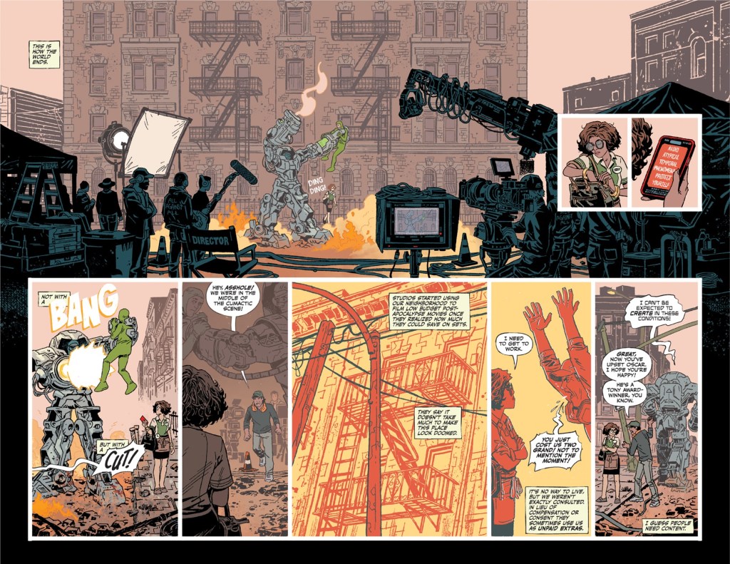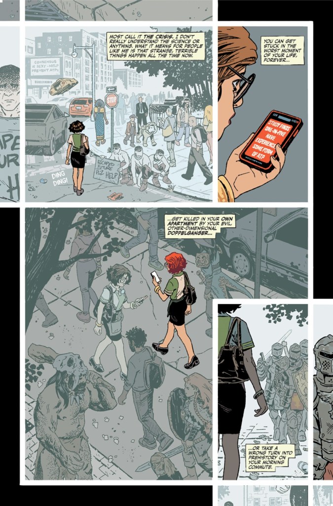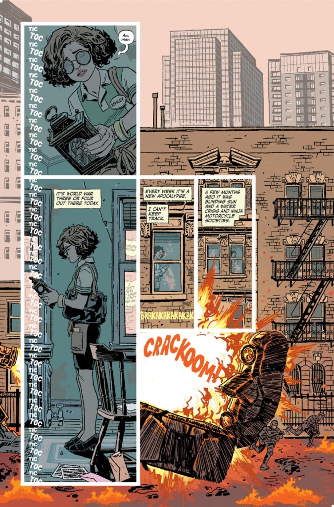 Meet Ashley, a young lady trying her best to get by in a world turned upside down, casually checking her phone for ‘Atypical Temporal Phenomenon’ alerts as she goes about her day-to-day business. To make things a little more confusing, the neighborhood outside Ashley’s house is used almost continually as a set for low-budget post-apocalyptic movies, meaning that she frequently finds herself waking up to things like Nazi parades and ravenous gangs of murderous cannibals, a situation which only further warps her sense of what’s real and what isn’t. And that’s essentially what this first issue is all about – an increasingly fractured young woman trying desperately to keep her grip on reality in a world where absolutely nothing is certain. And it’s absolutely brilliant.