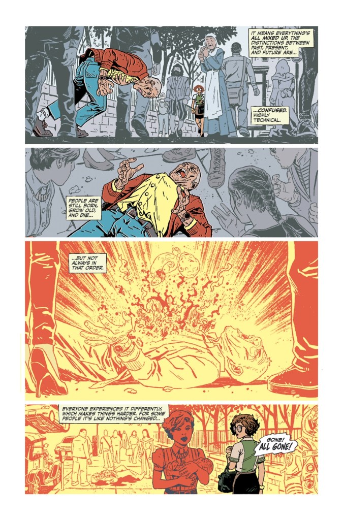 Given the expanded page count, series writer Deniz Camp is given all the time he needs to have things gradually unravel for Ashley. Starting with the breaking of a clock – itself something of an outdated antique given the aforementioned timey-wimey shenanigans, but in Ashley’s case the only tangible link to her deceased parents – she becomes more and more desperate and more and more frantic to get it fixed. The toll of living in such uncertain times continues to grind her down, and the lack of any clear grip on the passage of time makes for a disorienting way of life, to say the least.