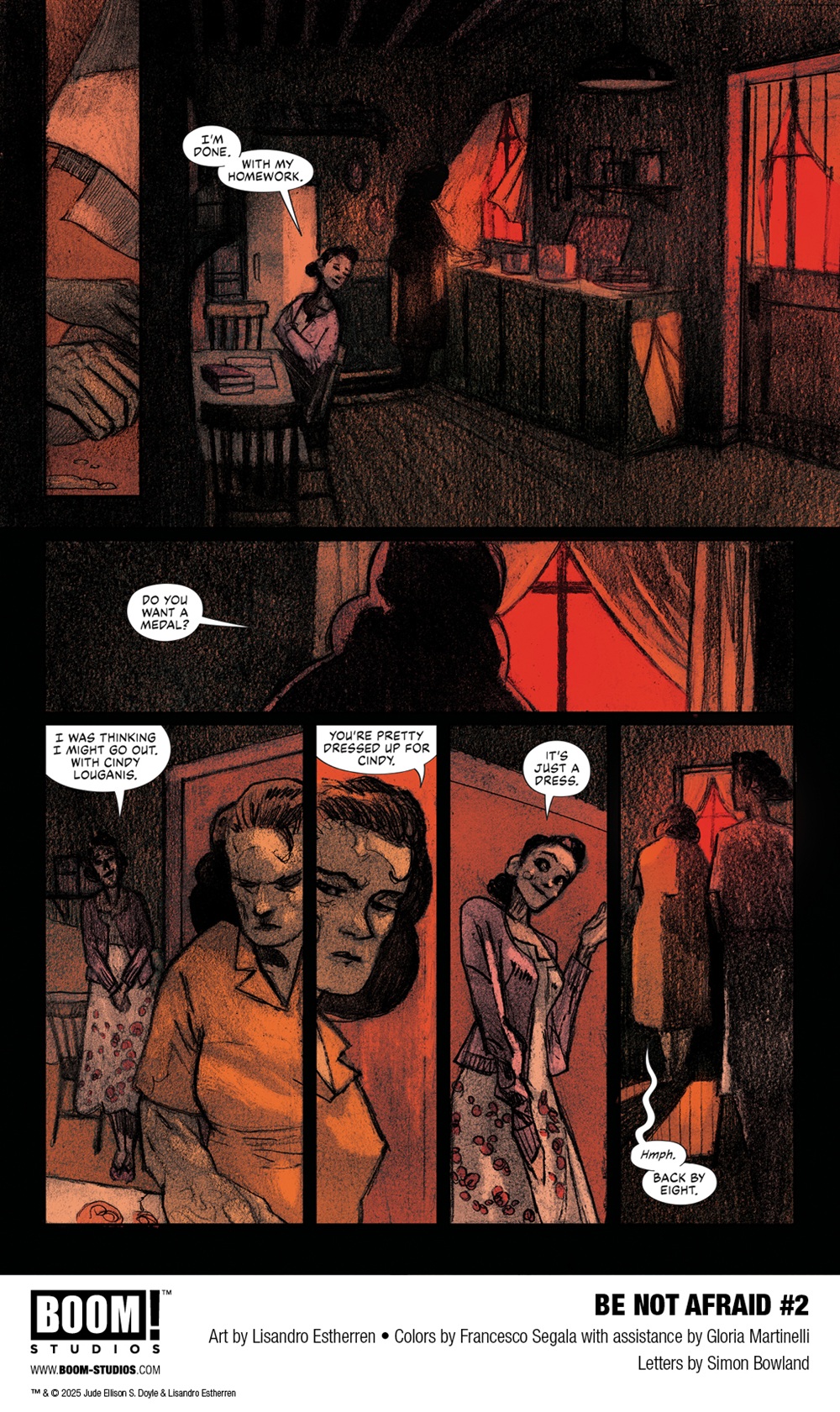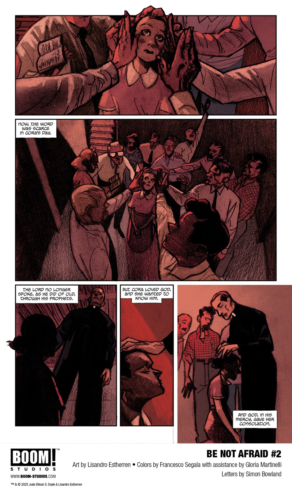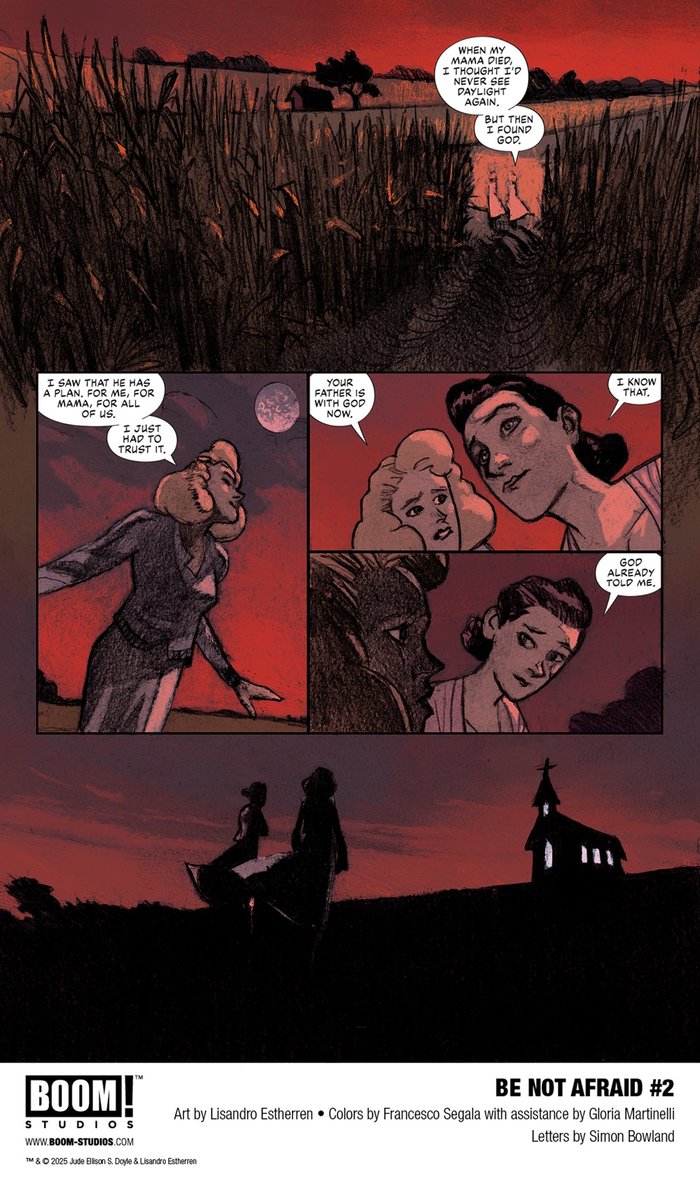 After a storming debut this past Wednesday, BOOM! Studios have dropped preview artwork for BE NOT AFRAID # 2, the second chapter of the series described as “equal parts feminist rage and rural folk horror”, from Jude Ellison S. Doyle (Hello Darkness, Maw), artist Lisandro Estherren (Redneck), colorist Francesco Segala with assistance by Gloria Martin, and letterer Simon Bowland.