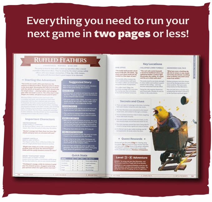 “Survive an arcane blizzard in the Arctic; sail with a djinni smuggling crew on the Coast; win a camel jousting tournament in the Desert; fight off werebears at an elven Forest campsite; look for sabotage in a caved-in Underground mine; tame air elementals in the Mountains; explore a mimic-infested Urban tavern; and so much more!”