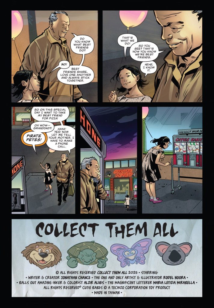 Quite possibly saving this horror anthology’s best story for last, Jonathan Chance’s “Collect Them All” is also this comic book collection’s most straightforward zombie-fest thriller – at least at the beginning when it seems that the author is simply corralling as many hapless innocents as he can muster into Pirate Pete’s Pizza House before unleashing a flesh-hungry cadaver amongst them. Enjoyably however, things don’t actually pan out that way at all, with the writer cleverly shifting the focus away from the adorable little Missy and her doting grandfather on to the staff working behind the counter at the fast-food diner.