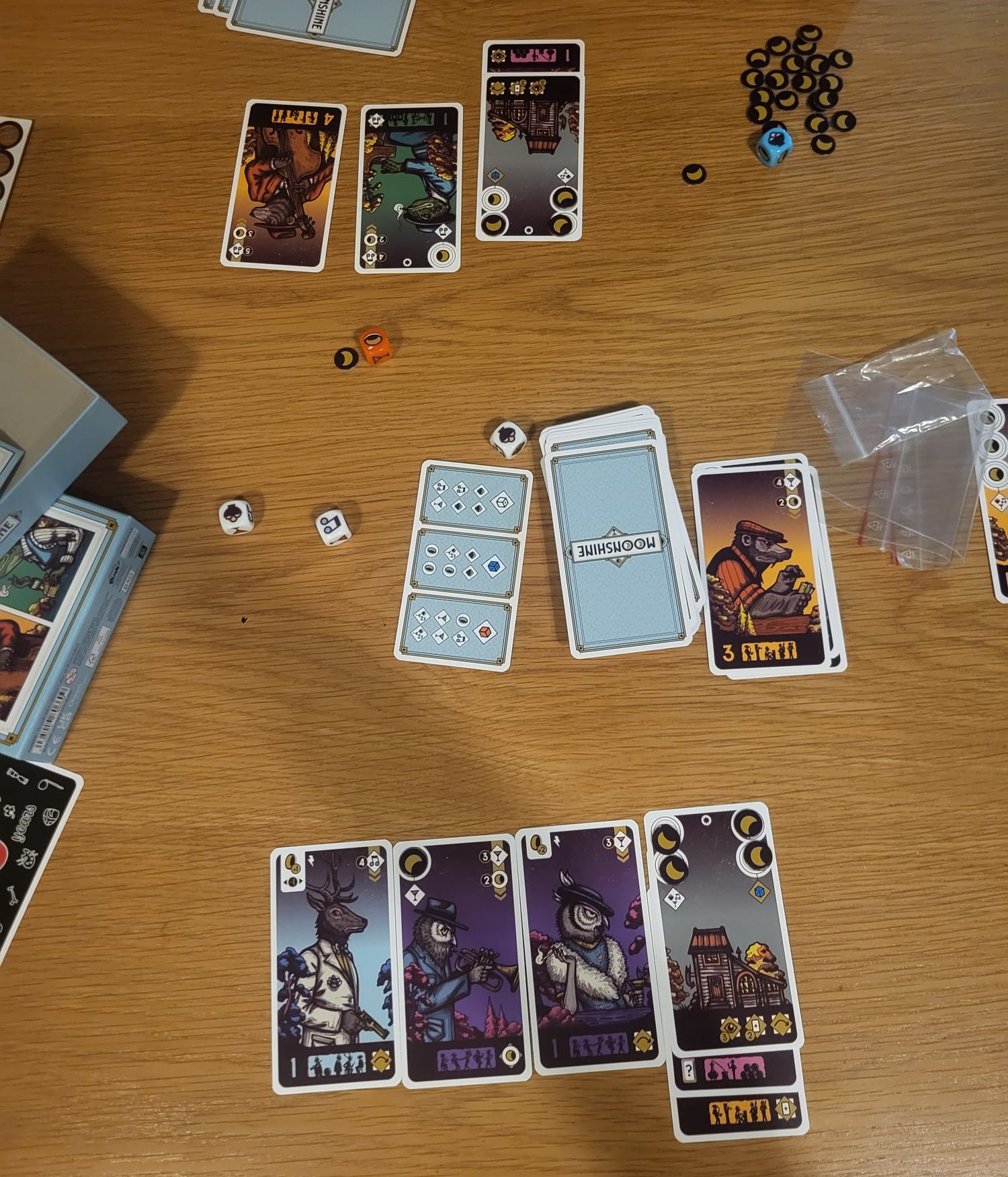 It’s got a lot going on but the icongraphy is clear and very straightforward. It can feel that players who unlock blue/orange dice early gallop ahead, but that simply is itself part of the strategic balance of the game. You can also always take moon tokens, which trigger character cards, so this itself acts as a natural balancer.