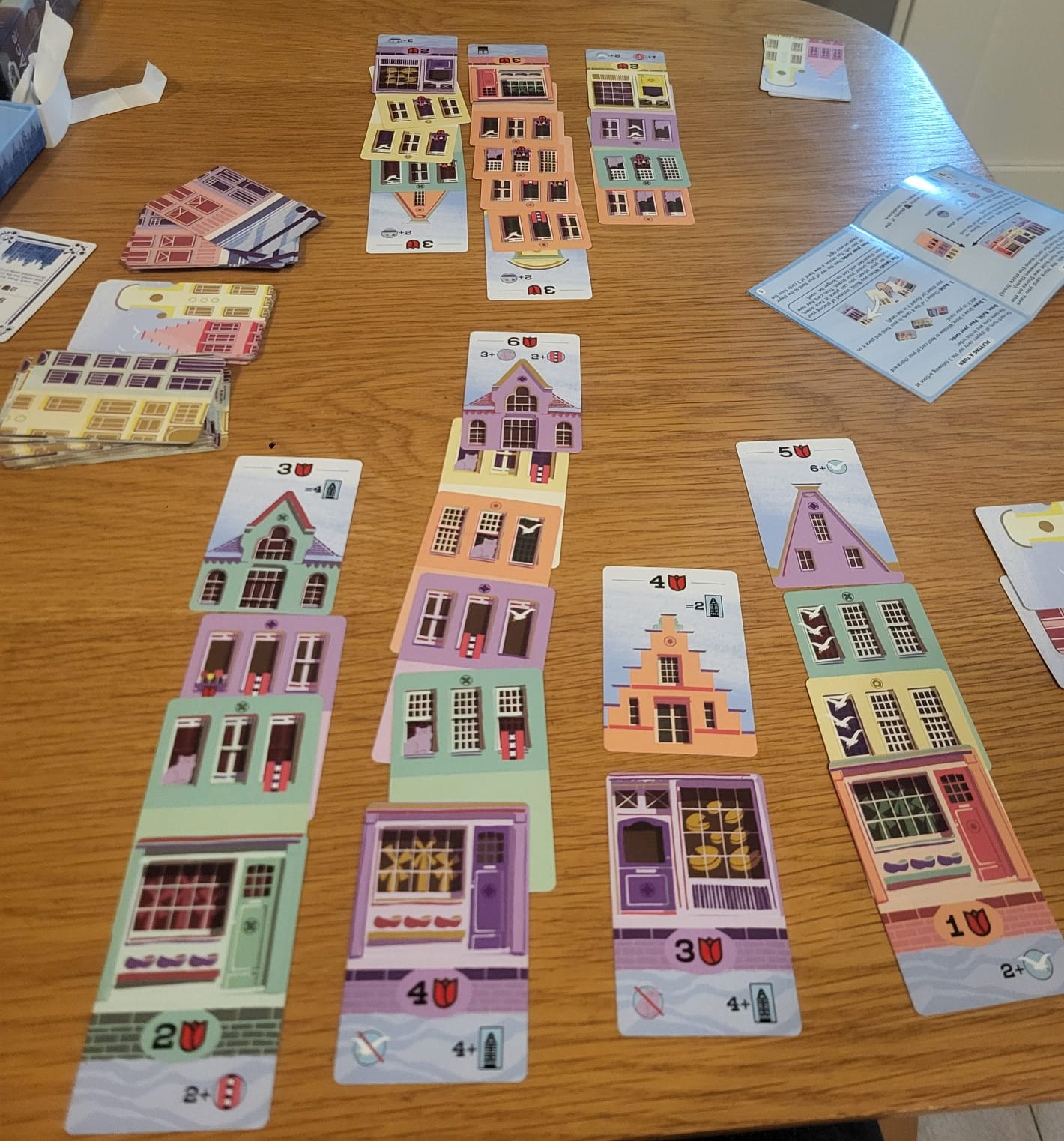 Starting with a hand of 3 cards, each turn you all draw from the base, level or roof decks. One of the neatest things about this game is this simultaneous play, because you choose a card from your hand to keep and then pass your whole hand round clockwise. I’m a bit of a sucker for drafting, from my old ccg days, so this was a treat.