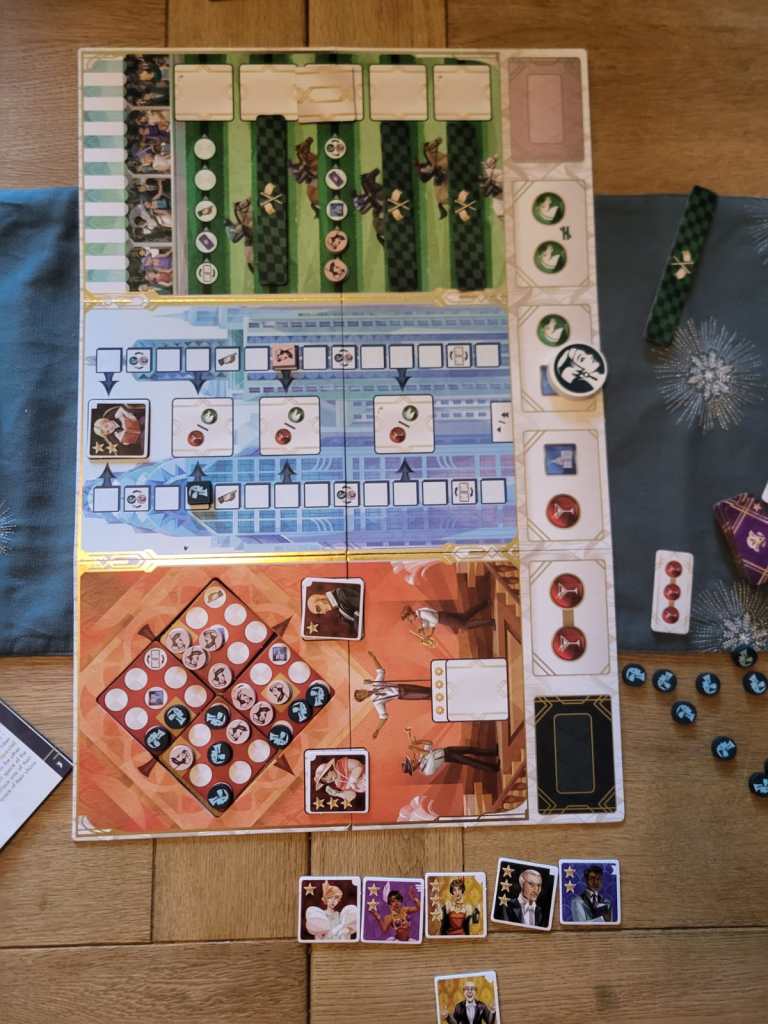 There are three areas of the board, the Cabaret, Finance District and Racecourse. Each has a different influence track, and you aim to collect either 5 different suits of socialites or 3 of the same. Players alternate, picking one of the available actions, but not repeating the previous.